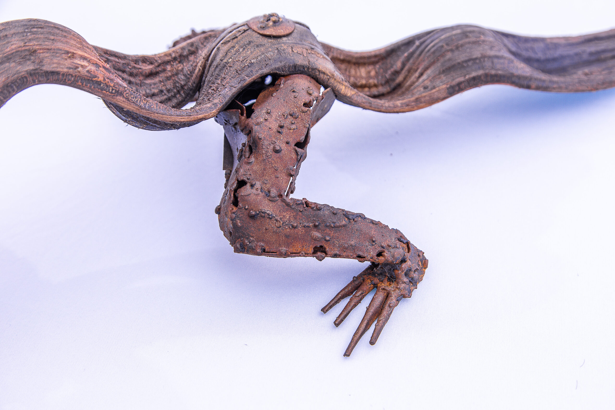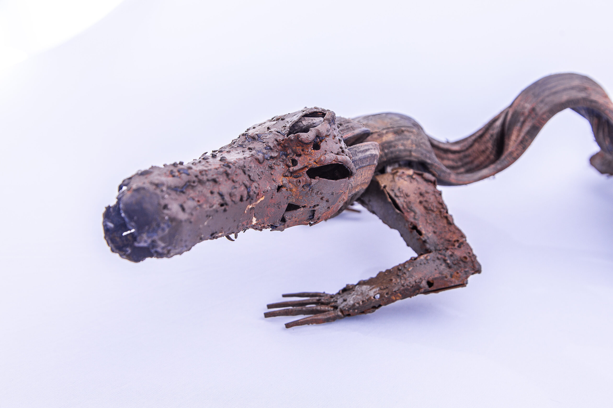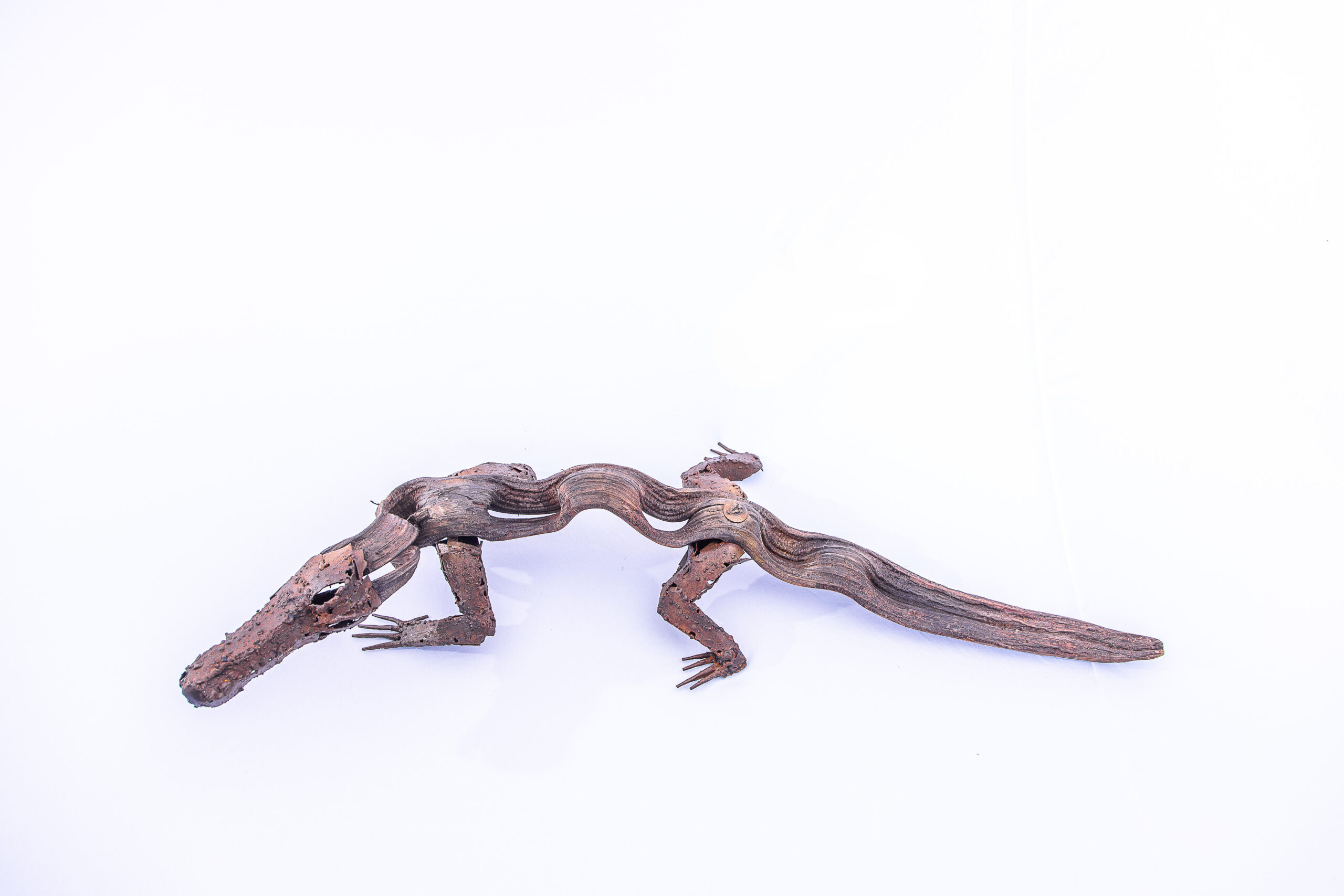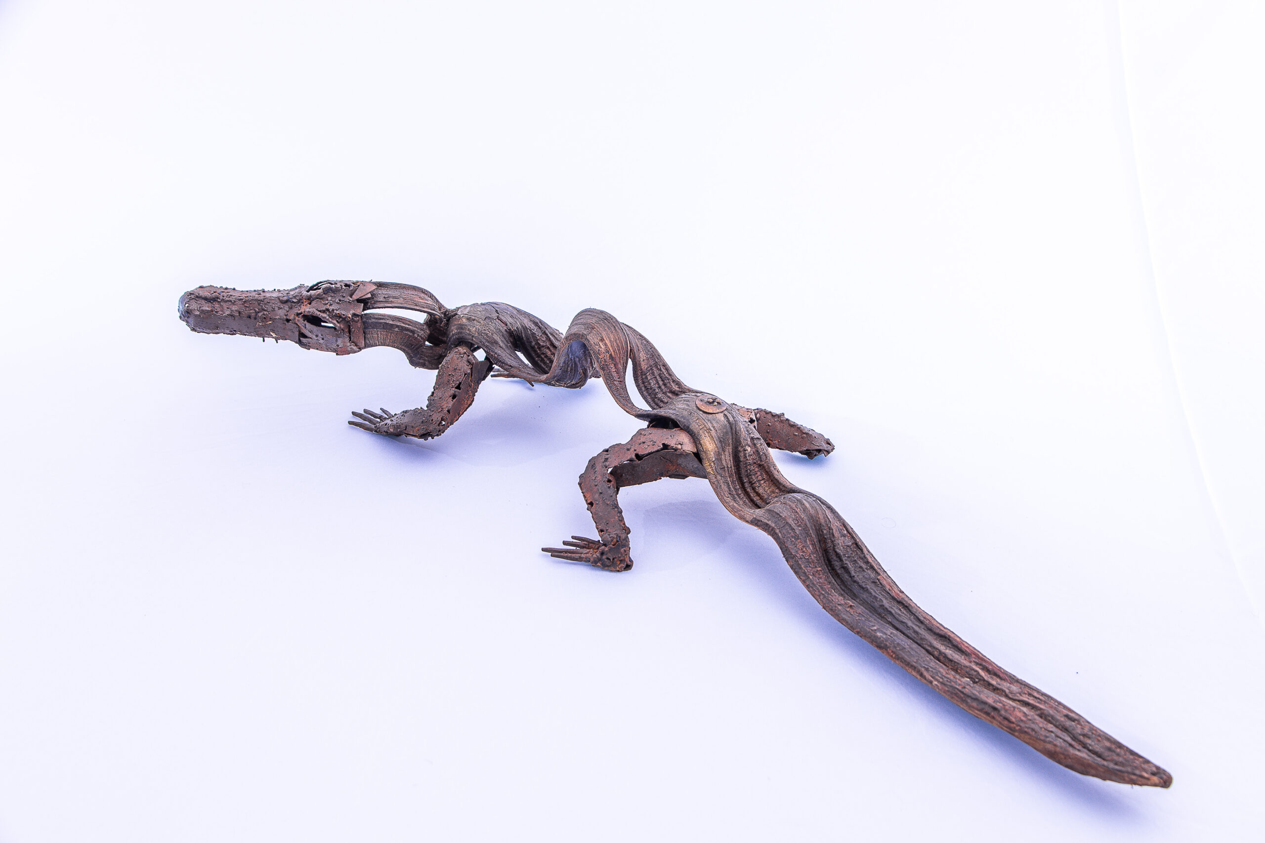 Sobre a obra: A obra “Jacaré”, do artista Agnaldo Adélio, é uma escultura em aço carbono que se destaca pela sua representação expressiva de um animal icônico do Pantanal. Premiada no 23º Salão Jovem Arte em Cuiabá, em 2007, a escultura, que mede 80 cm x 33 cm x 15cm e pesa 2,8, utiliza um padeço de cipó escada de macaco, evidenciando a beleza e o dinamismo de sua forma. A combinação das lâminas de aço com a madeira reflete uma abordagem inovadora e sustentável, alinhando estética e respeito ao meio ambiente.