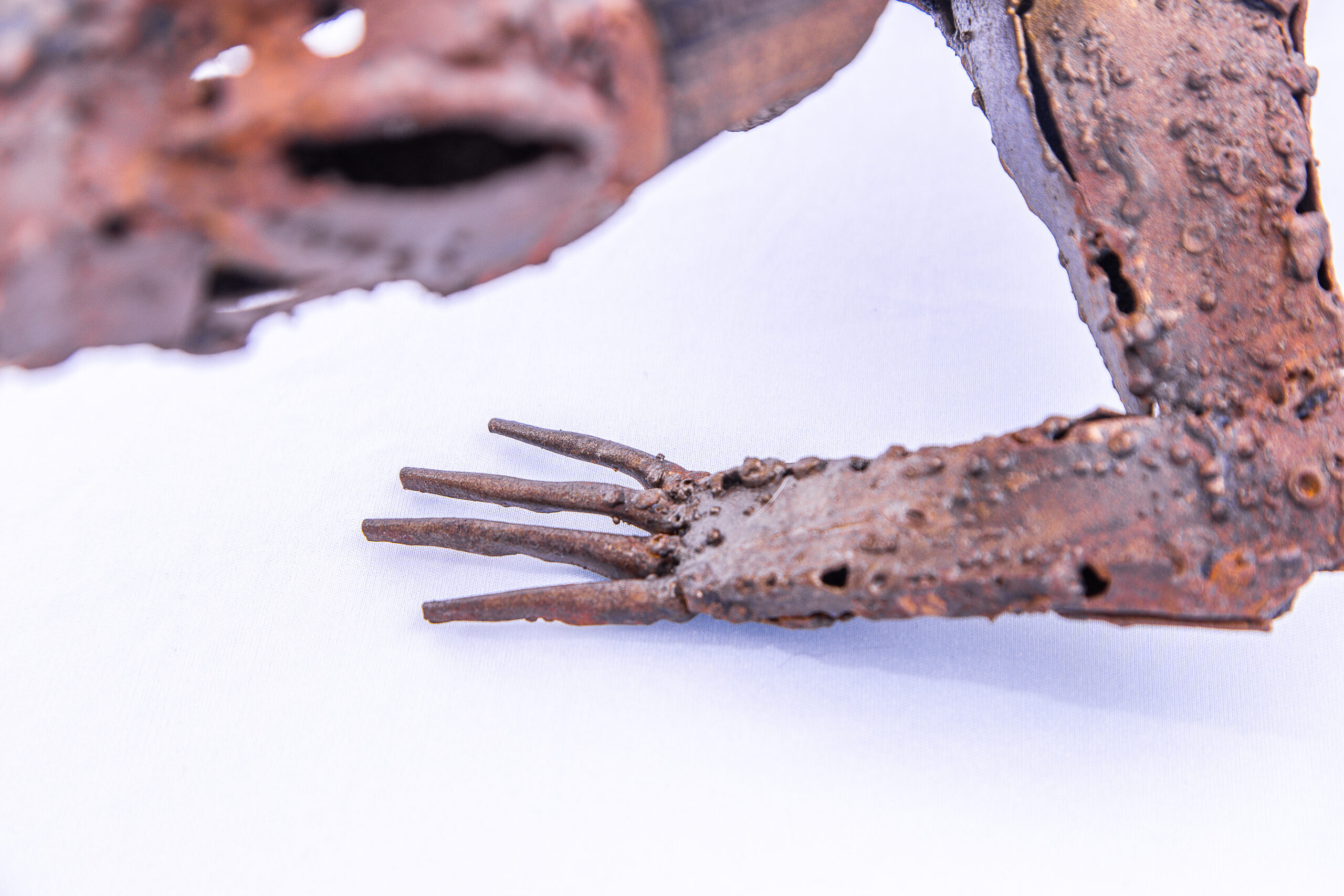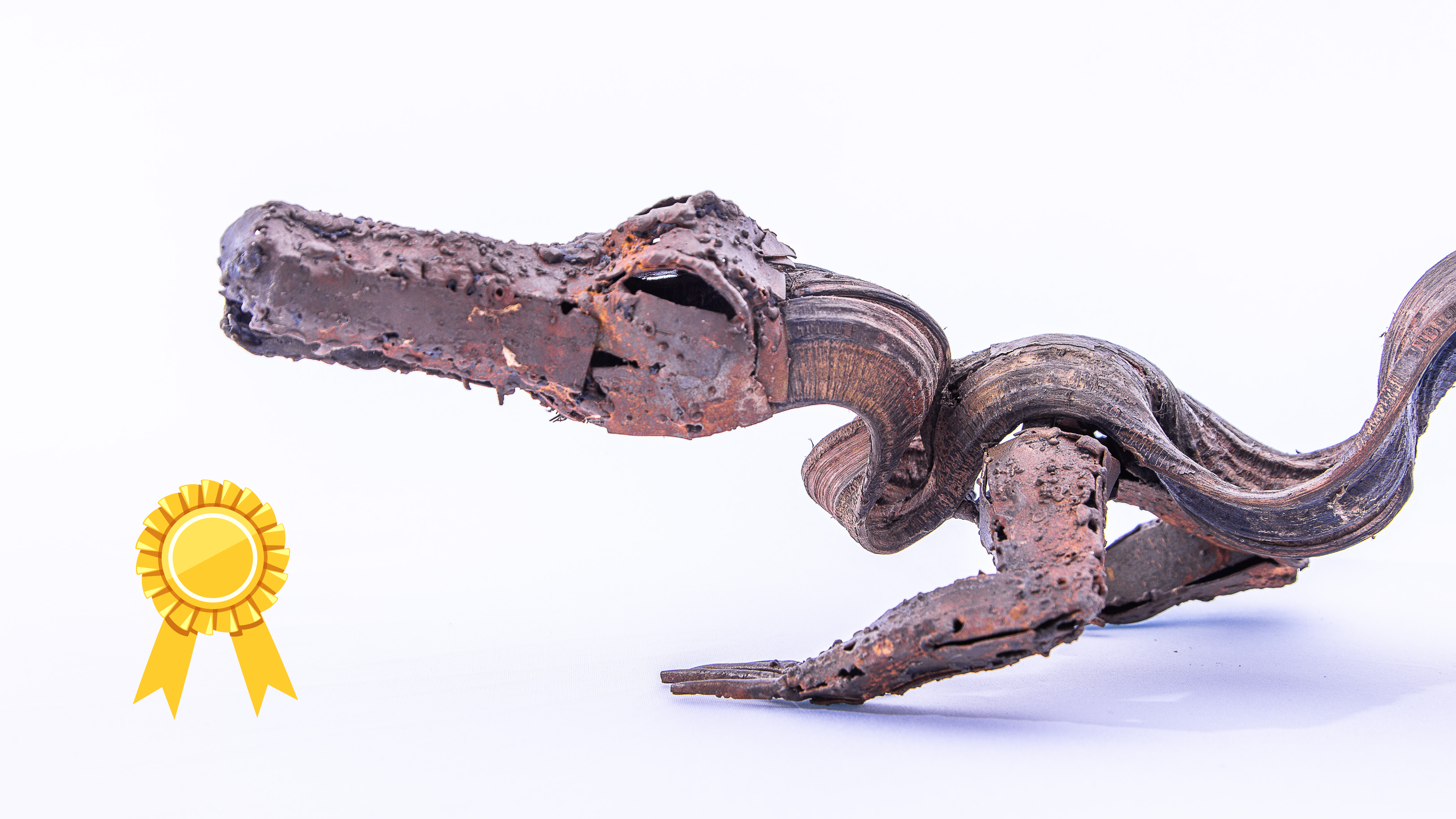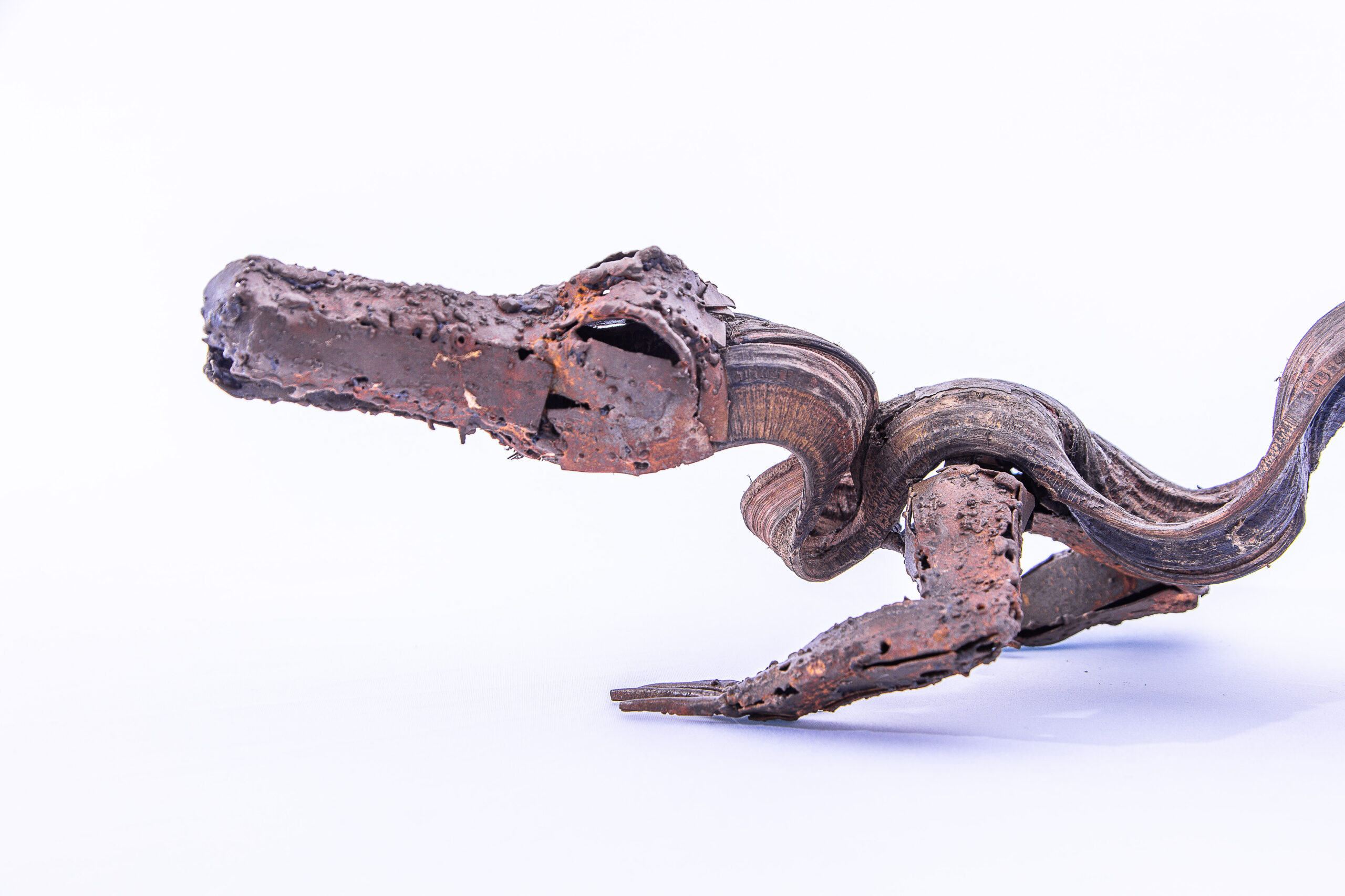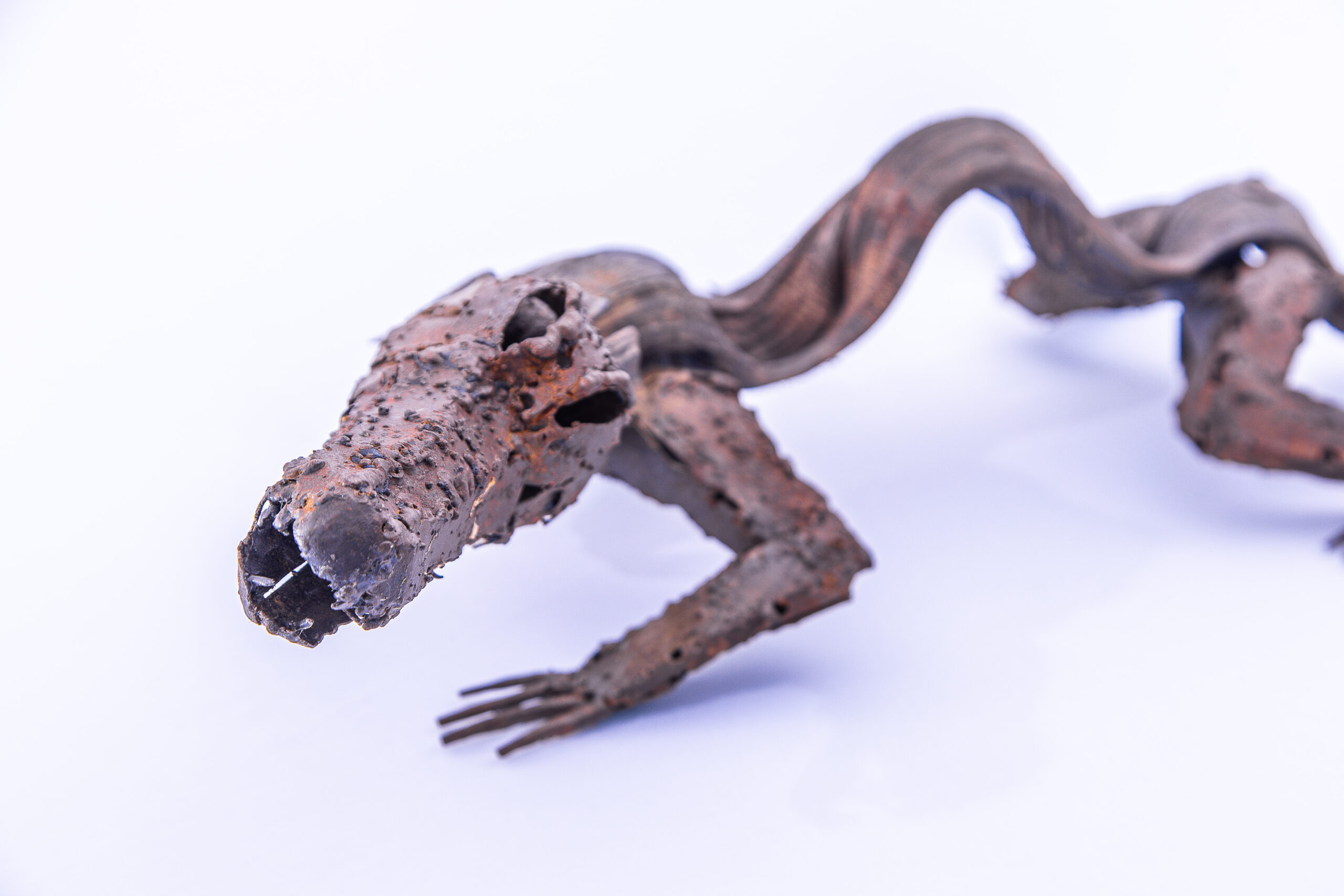 Sobre a obra: A obra “Jacaré”, do artista Agnaldo Adélio, é uma escultura em aço carbono que se destaca pela sua representação expressiva de um animal icônico do Pantanal. Premiada no 23º Salão Jovem Arte em Cuiabá, em 2007, a escultura, que mede 80 cm x 33 cm x 15cm e pesa 2,8, utiliza um padeço de cipó escada de macaco, evidenciando a beleza e o dinamismo de sua forma. A combinação das lâminas de aço com a madeira reflete uma abordagem inovadora e sustentável, alinhando estética e respeito ao meio ambiente.